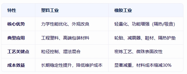 在塑料與橡膠工業(yè)領(lǐng)域,玻璃珠(尤其是空心玻璃微珠)作為彈性體改性材料,其應(yīng)用特點(diǎn)可歸納為以下核心優(yōu)勢與分析: