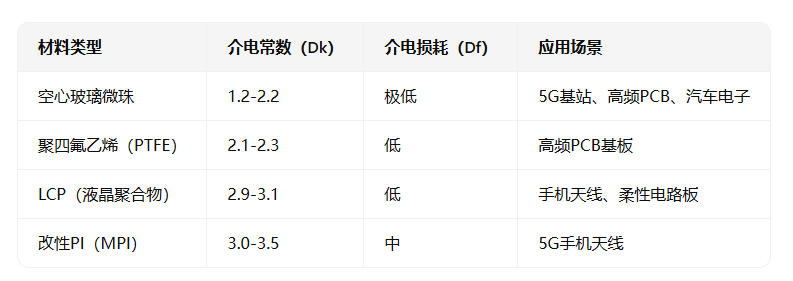 空心玻璃微珠的介電常數(shù)在100MHz下僅為1.2-2.2,遠(yuǎn)低于5G要求的2.8-3.2,甚至低于傳統(tǒng)低介電材料如聚四氟乙烯(PTFE,Dk≈2.1-2.3)。
